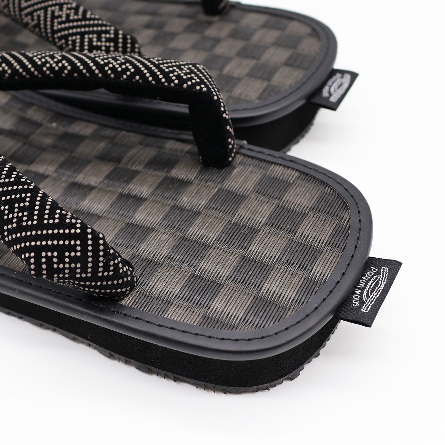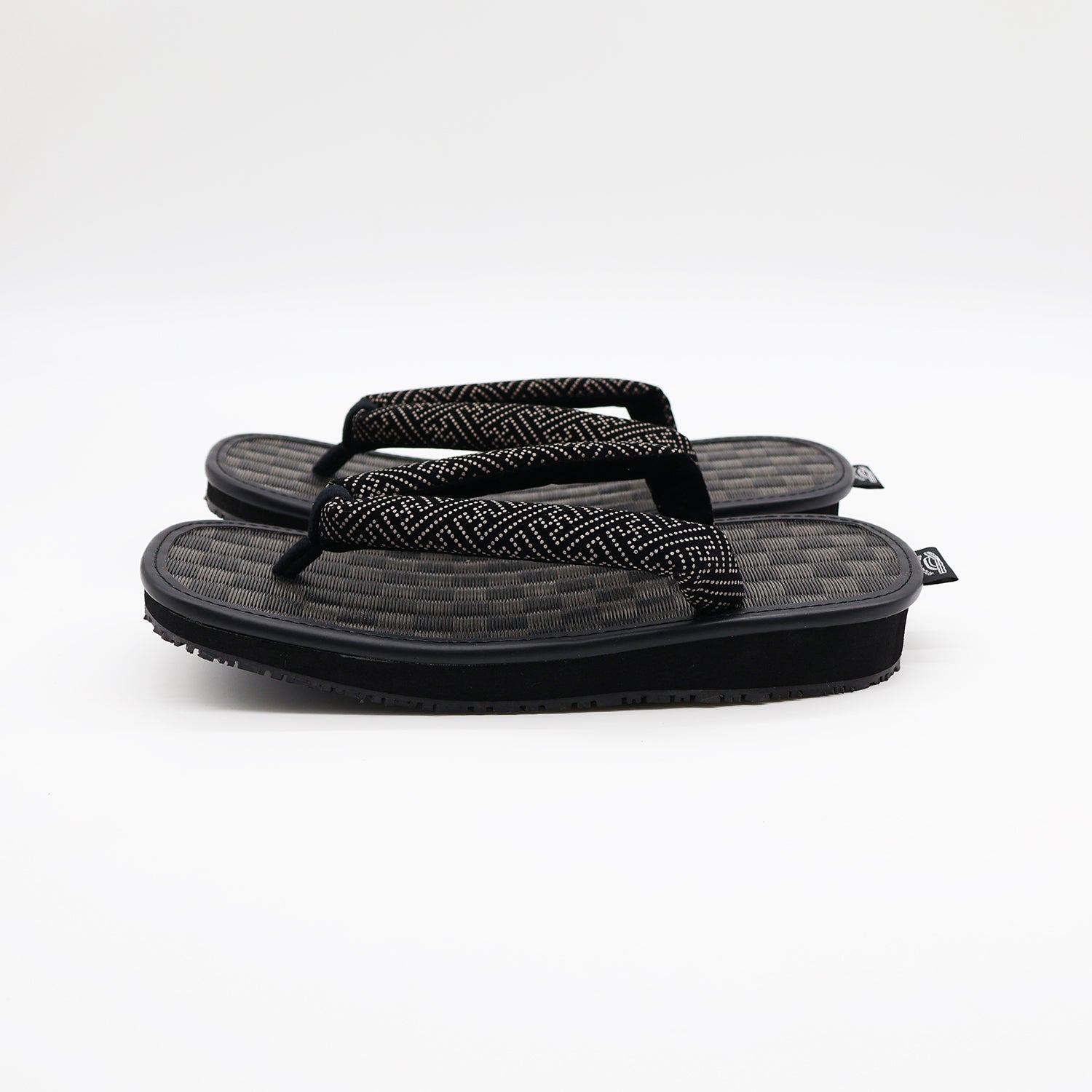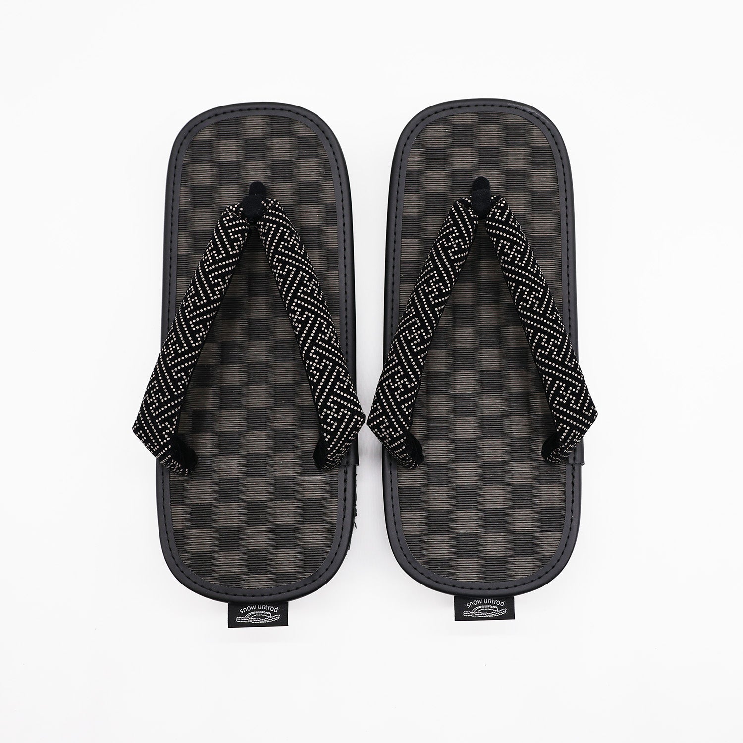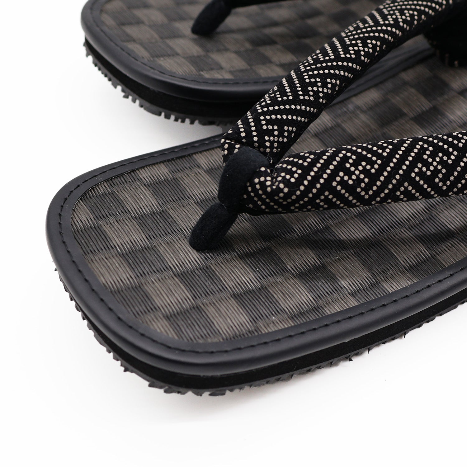 シンプルイズベストな1足。天板は汚れに強く丈夫なPP製市松模様の黒畳、鼻緒には伝統柄である紗綾型印伝調テキスタイルを採用。底面はクッション性と滑りにくい素材を使用し、コンクリート舗装など現代の生活環境でも歩きやすいように実用性をプラスしています。鼻緒と天板のカラーの組み合わせは抜群です。縁起の良い1足。