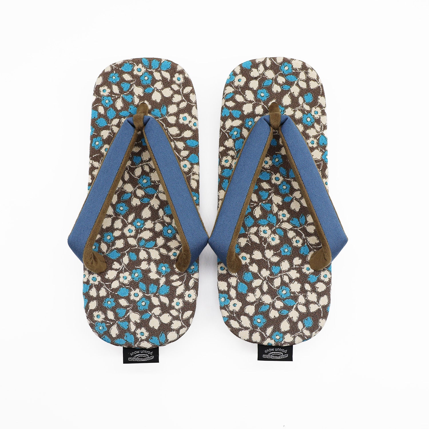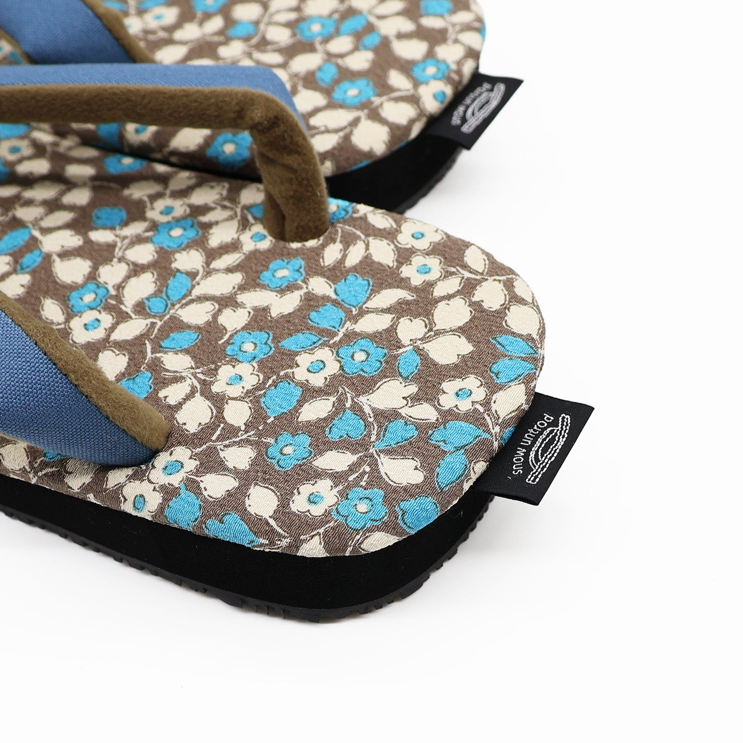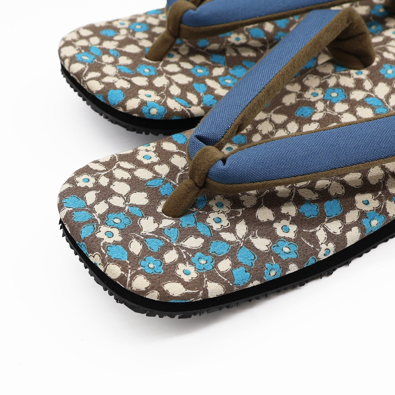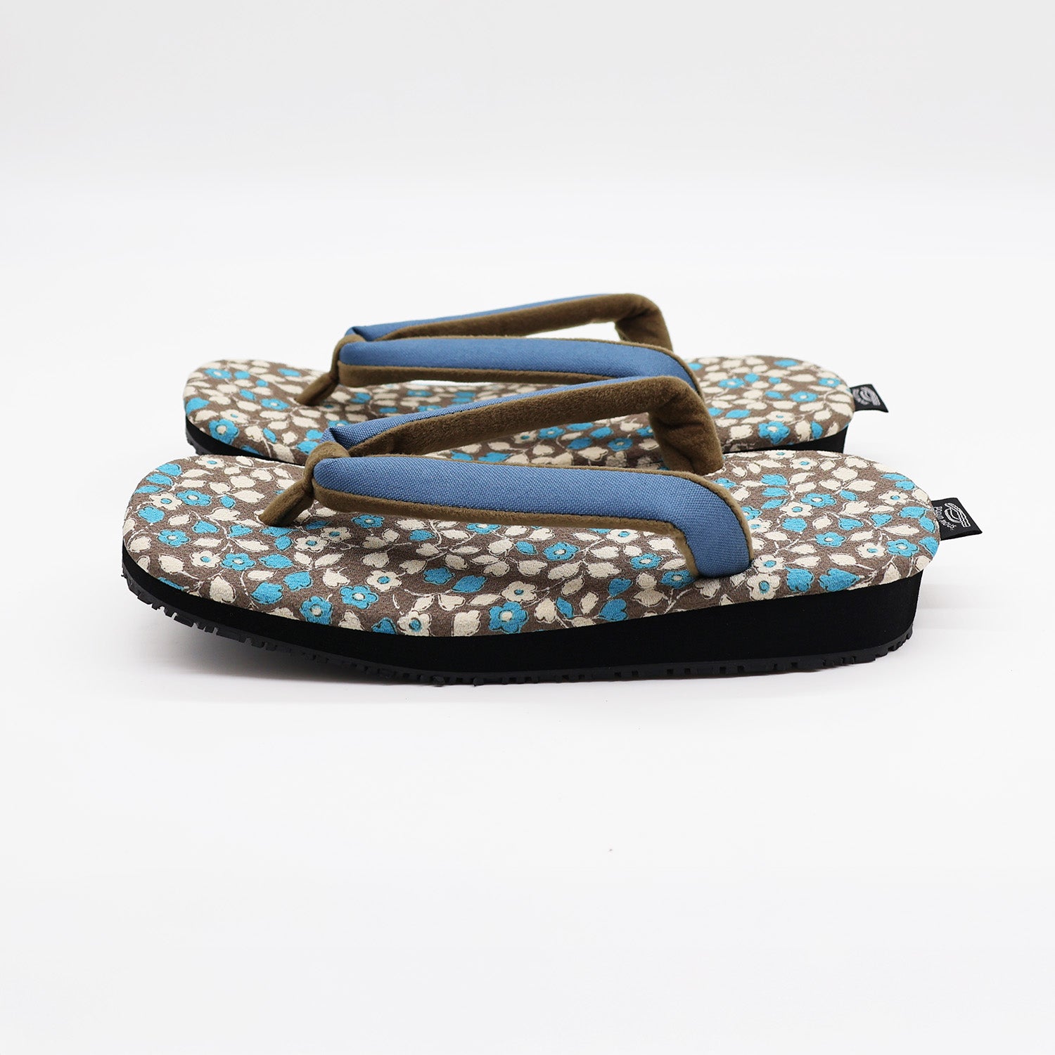 天板に小花柄をあしらったちりめんを採用。鼻緒は天板の色に合わせた帆布と柔らかな生地で全体的なカラーリングの調和を意識しています。ちりめんの足当たり柔らかく落ち着いた印象の1足です。底面はクッション性と滑りにくい素材を使用し、コンクリート舗装など現代の生活環境でも歩きやすいように実用性をプラスしています。