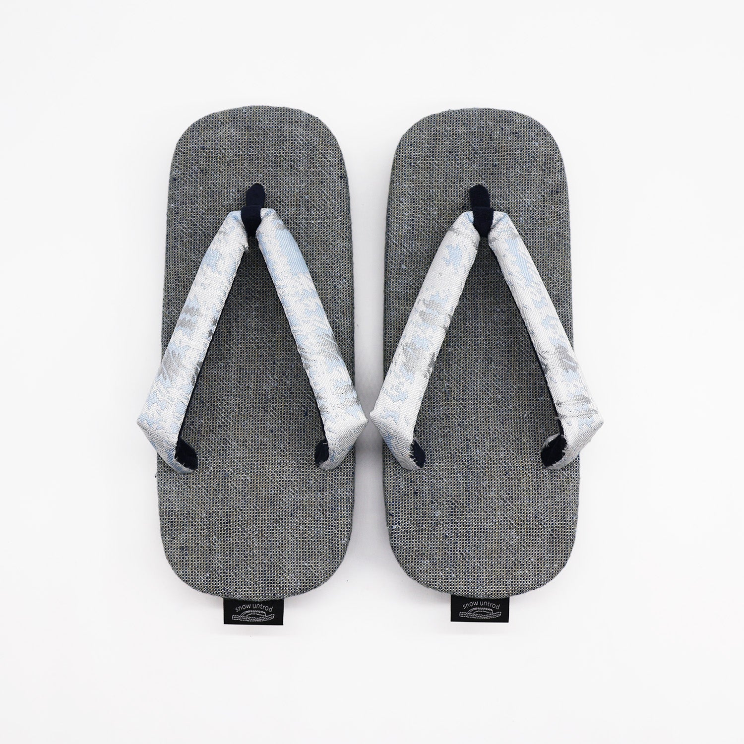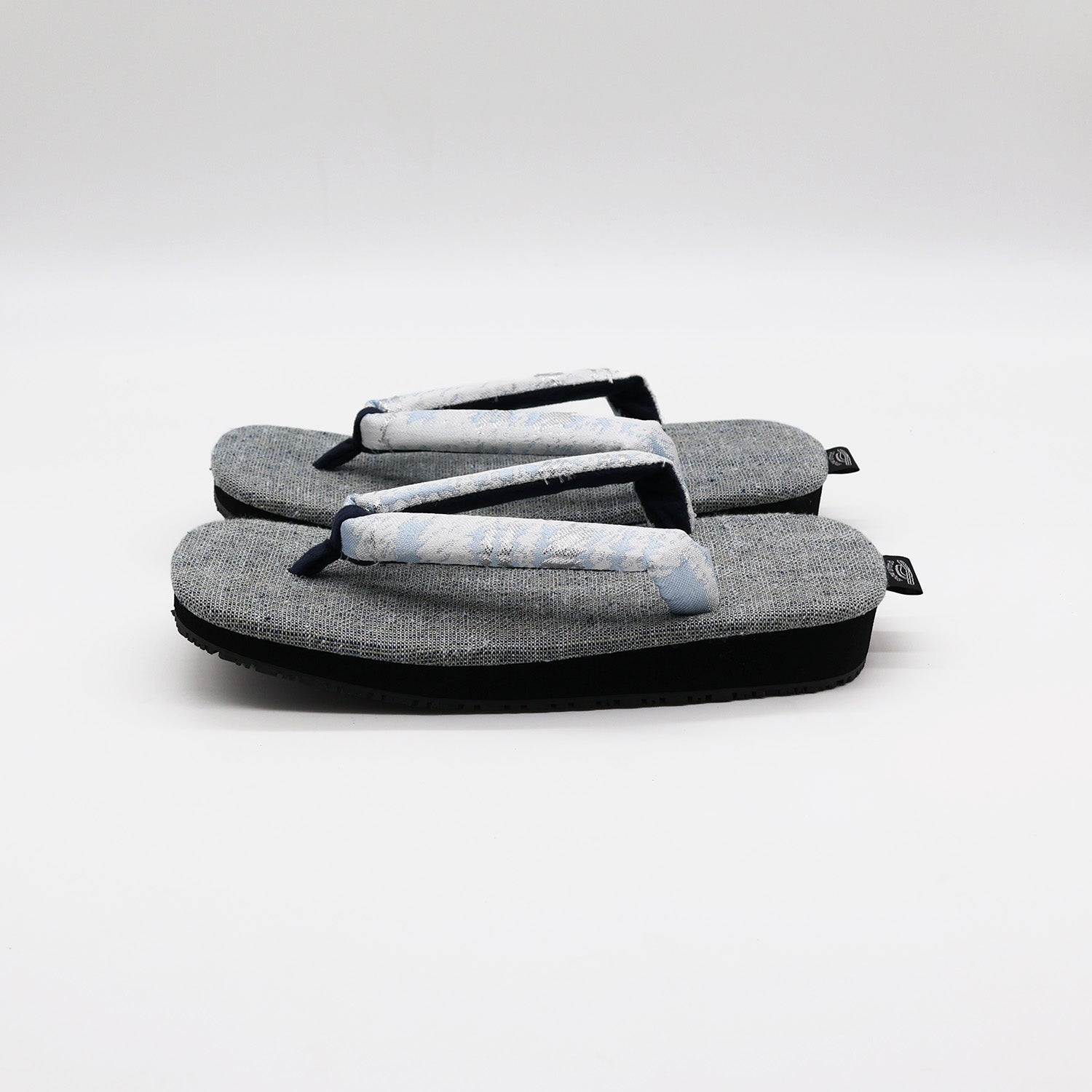鼻緒に銀の刺繍が目を引くテキスタイルを採用。銀の刺繍の配置・薄い青と白のカラーバランスは、唯一無二のデザインで個性を発揮できます。鼻緒裏・先つぼは優しい生地で足当たりよく仕上げています。天板は藍染とザクロ染を織り込んだ厚めの日本製織素材を採用。優しい色合いが魅力で、足当たり・肌触りの良い仕上がりになっています。底面はクッション性と滑りにくい素材を使用し、コンクリート舗装など現代の生活環境でも歩きやすいように実用性をプラスしています。