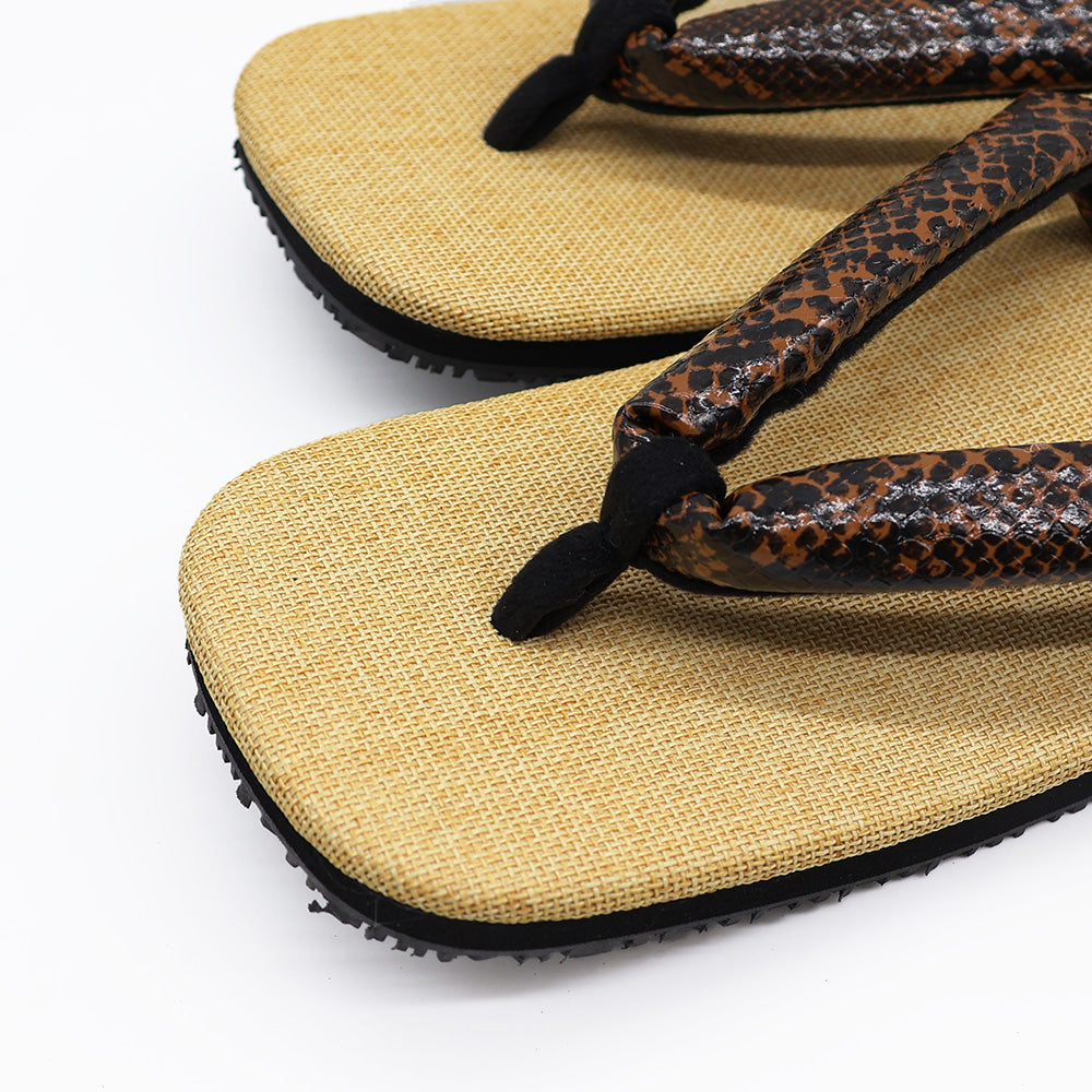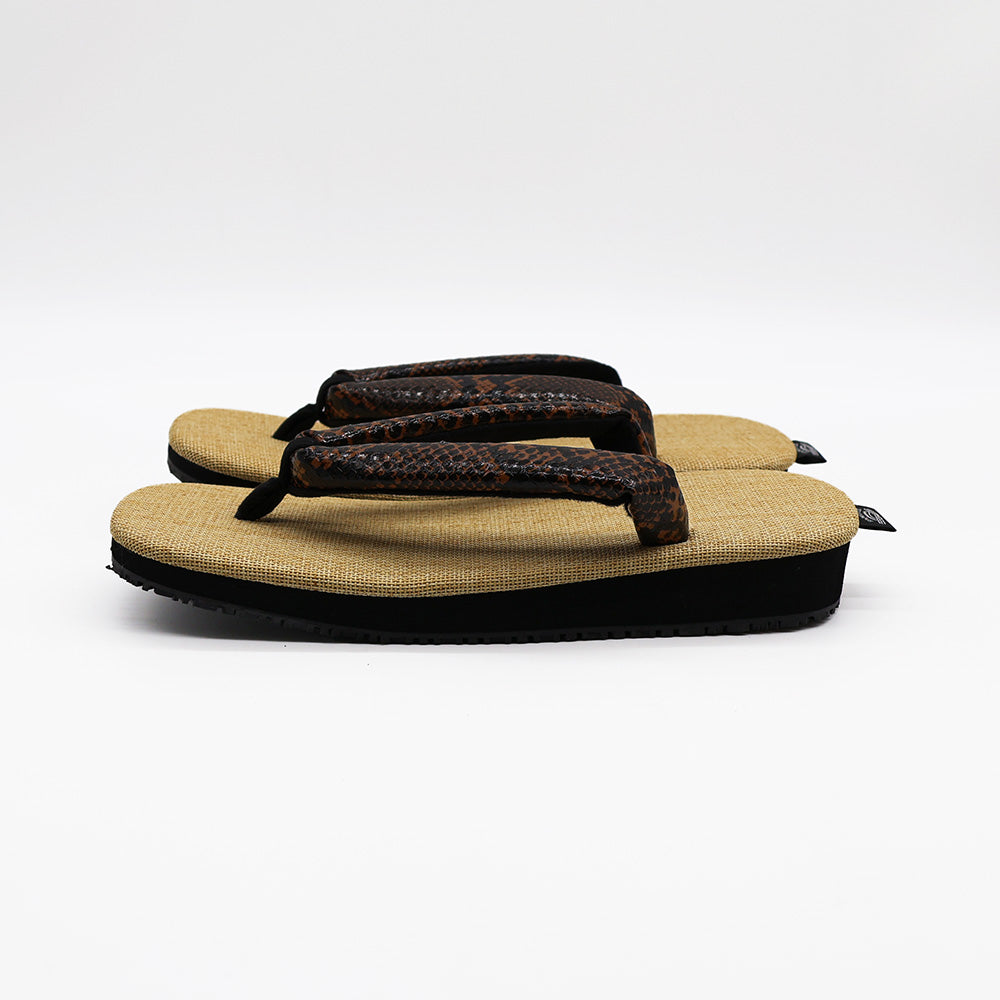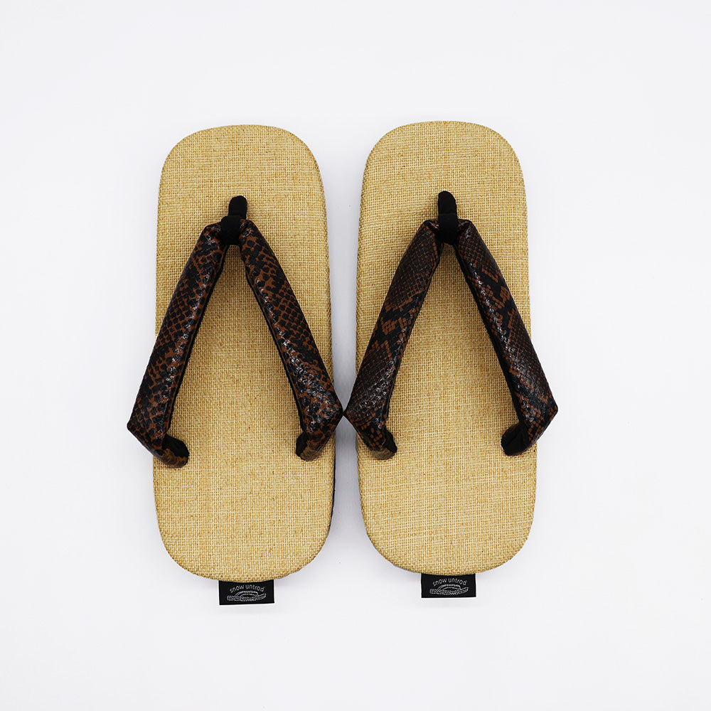 天板に和紙を折り重ねたテキスタイルを使用。吸湿性があり、爽やかな肌触りが特徴です。鼻緒には合成皮革のパイソン柄のテキスタイルを使用。圧倒的な個性差を出せる1足に仕上がっています。底はクッション性と滑りにくい素材を使用し、コンクリート舗装など現代の生活環境でも歩きやすいように実用性をプラスしています。