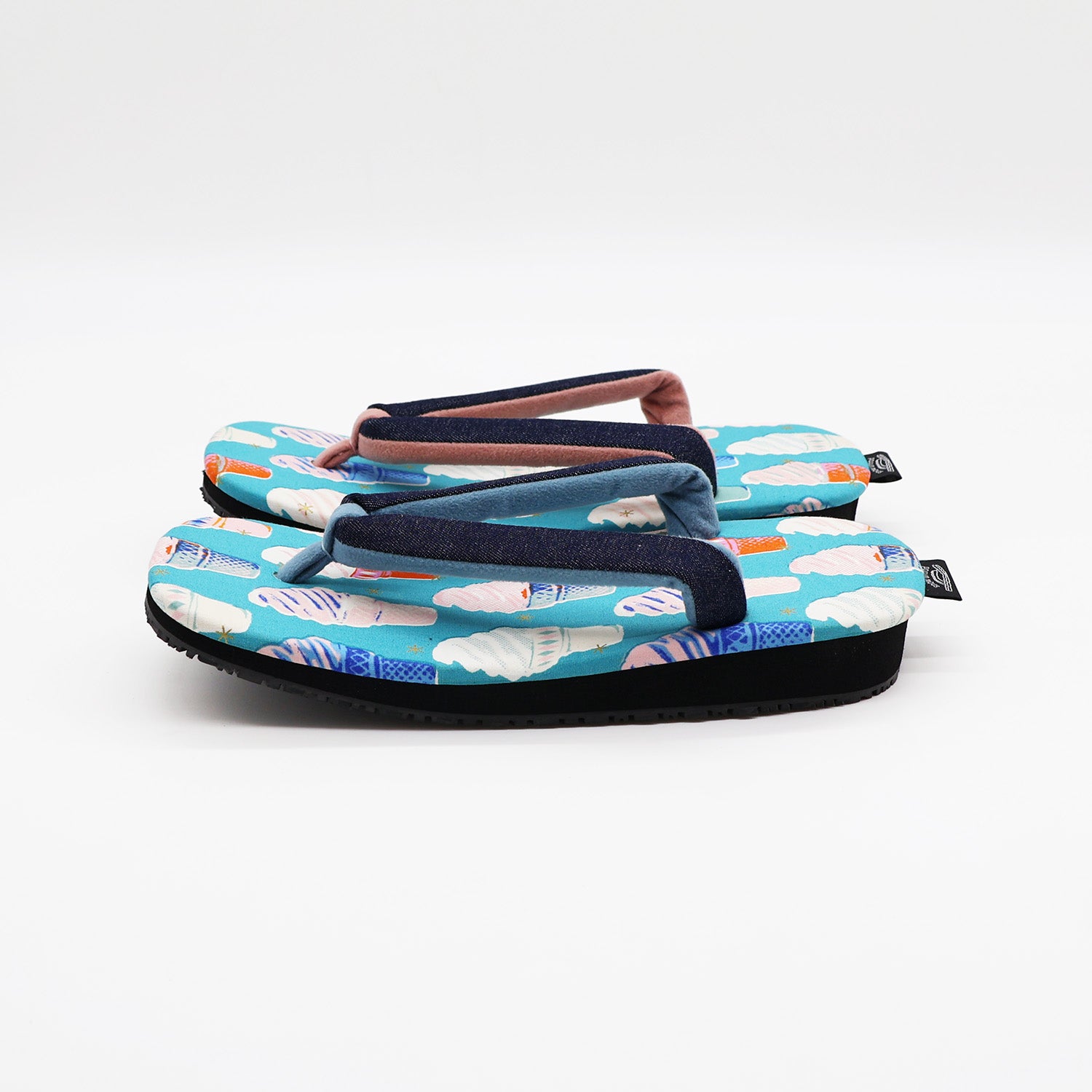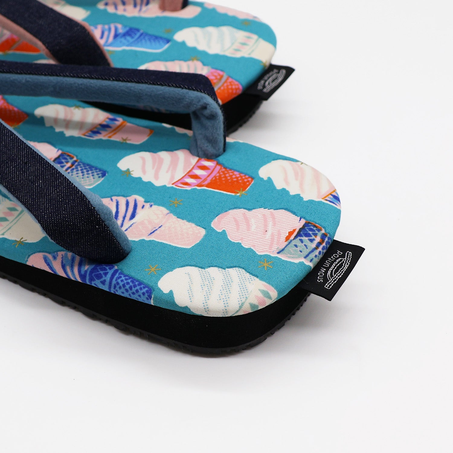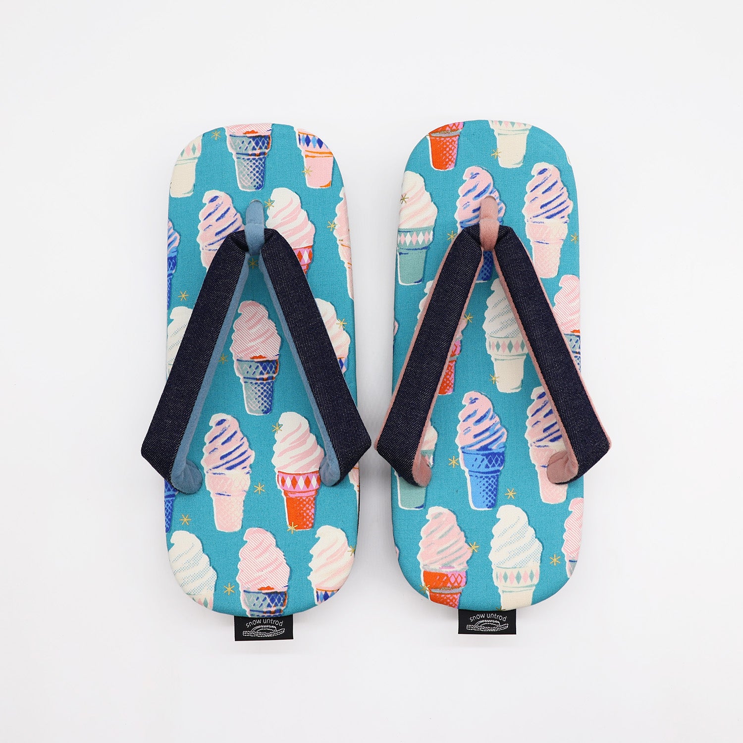 天板には可愛いSoftcream柄のコットン生地を採用。足当たりよくさらっとした肌触りの1足。鼻緒の表面はデニムで、左右の裏・先つぼは色の異なる帆布生地を使用し遊び心を+しています。底面はクッション性と滑りにくい素材を使用し、コンクリート舗装など現代の生活環境でも歩きやすいように実用性をプラスしています。